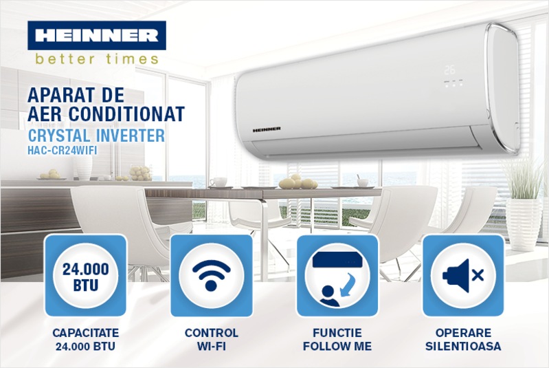 | Aparat de aer conditionat HEINNER Crystal Wi-Fi 24000 BTU, Clasa A++, Functie incalzire, Filtru cu densitate ridicata, Follow me, Functie Turbo, R32, HAC-CR24WIFI, Alb | |